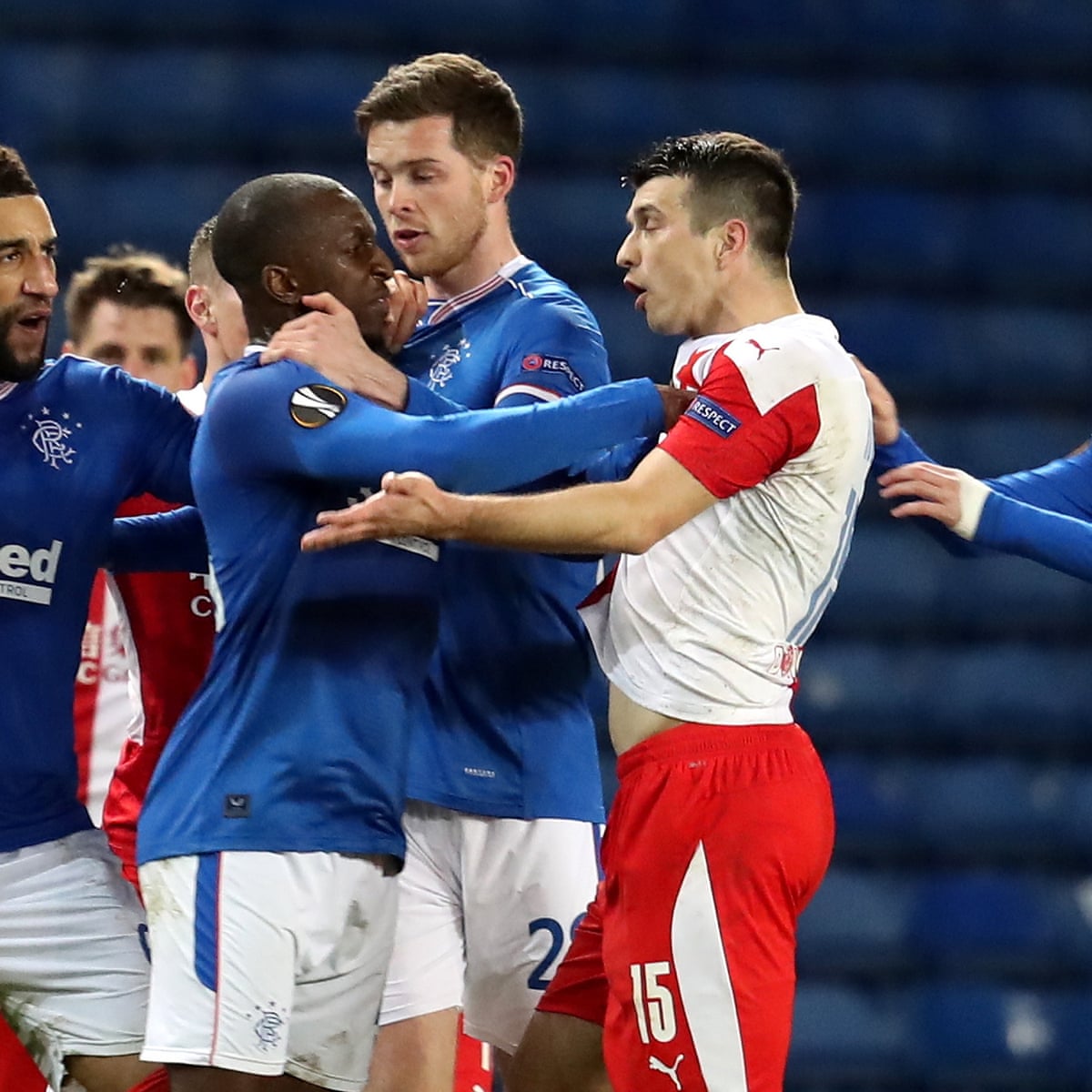 The spat that started in the round-of-16 game in the Europa League in 2020 was rekindled in their most recent group stage clash in the Europa League this season. 2 days agoGlen Kamara the Rangers midfielder was sent off for two bookable offences and booed by the crowd during his teams 1-0 defeat by Sparta Prague in the. Kamara was clearly targeted by some of the 10000 fans six months after being subjected to abuse by Slavia Prague defender Ondrej Kudela which earned the Czech Republic defender a 10-game UEFA ban.